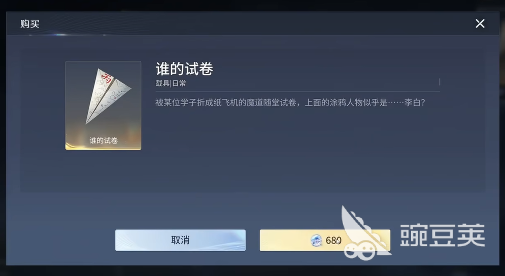 王者荣耀世界里有一架纸飞机,名字叫"叫谁的试卷"。光是这个名字,就已经让人忍不住多看两眼了。这款载具是付费获取的,今天小编就带来王者荣耀世界纸飞机介绍。它的外形非常特别,上面还有可爱的李白形象。相信大家都很喜欢这个载具,下面就来介绍一下。