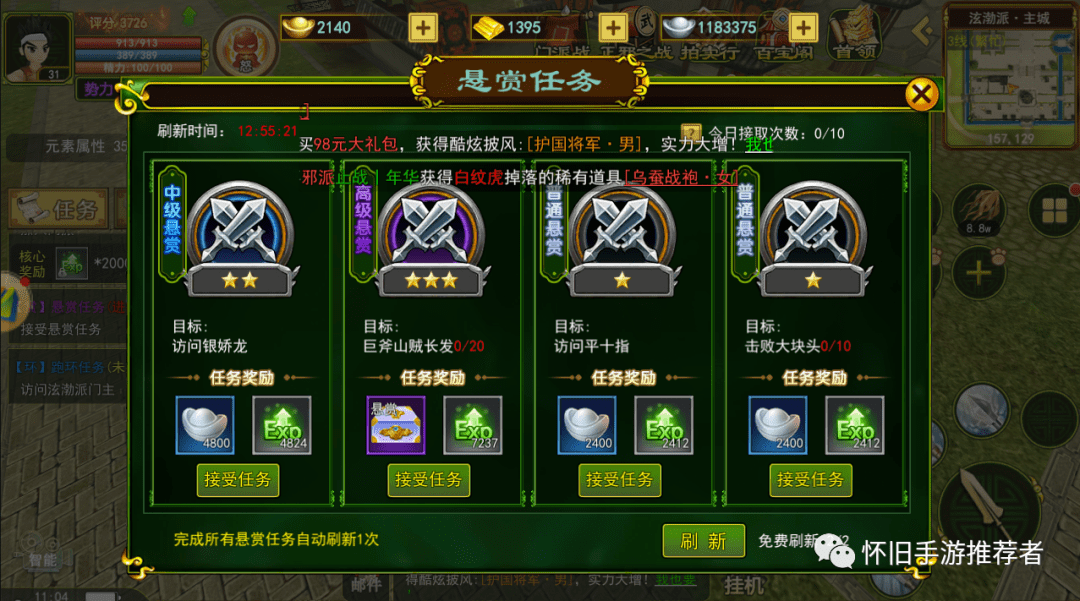每天在玄勃派主城NPC:老捕头处可以接取悬赏任务,根据任务星级不同获得的奖励也不同,任务星级越高奖励则越高,除了高额的经验奖励之外,高星级的任务还有机会获得稀有装备!因此,尽可能的要刷到高级别悬赏任务后再点击接受哦。