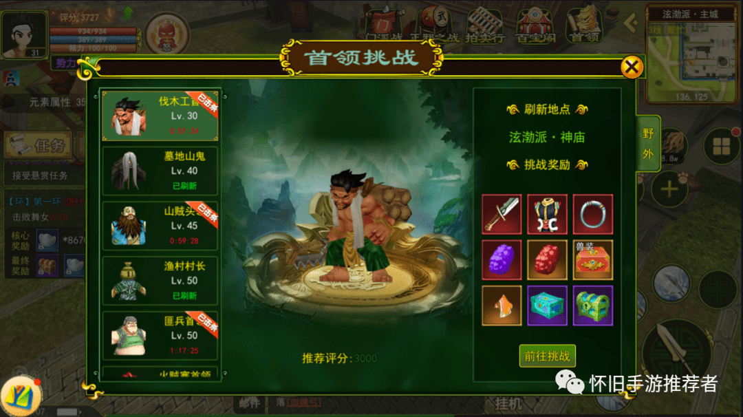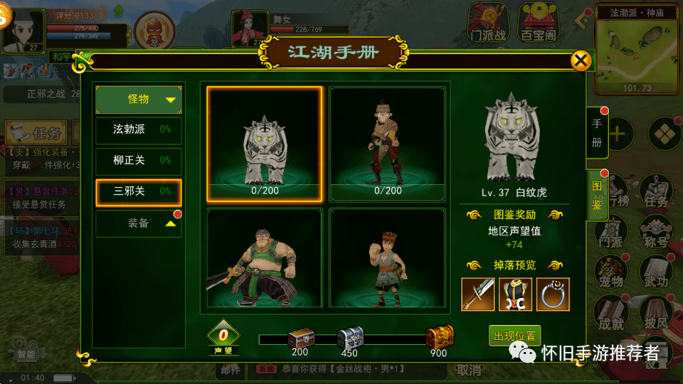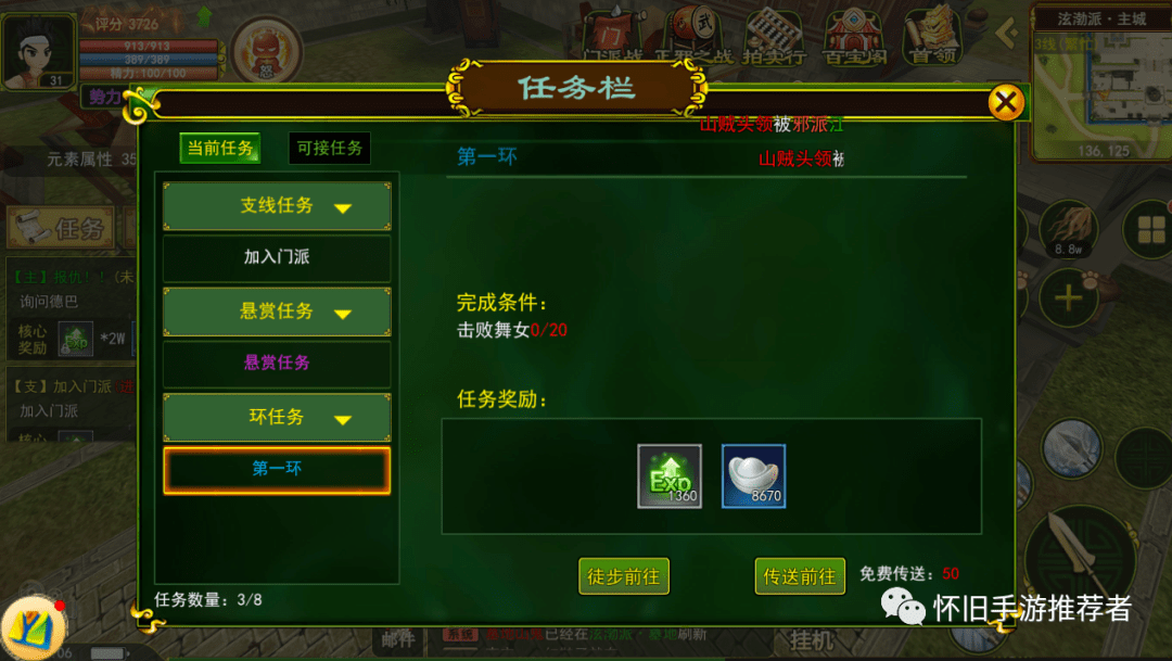 当等级达到25级左右,挂机升级效率会逐步降低,此时可以选择在NPC:玄勃派门主处可以接取跑环任务,完成任务可以获得大量经验奖励以及各类强化石奖励!每天固定免费强化石产出!跑环任务强烈推荐每天做满三次10环。