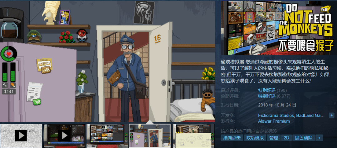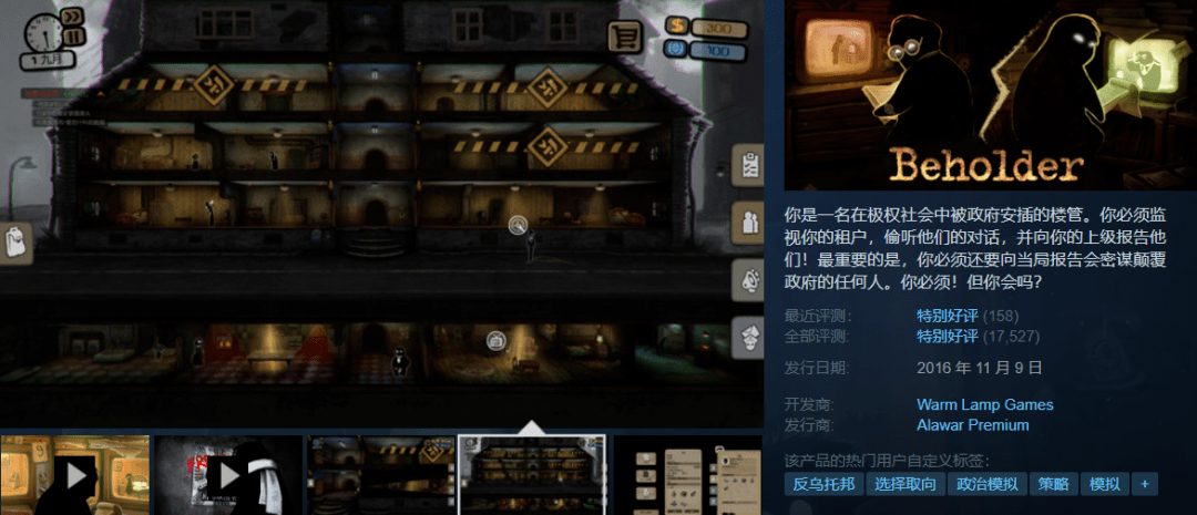 【短评】:这款游戏表现了比书籍更多的政治压迫感,当吃苹果、聚会、看书、讨论国家事务都违法的时候,没有人可以保全自己。……)救不了的女儿可以重开,关不掉的广播可以电脑静音。那,现实呢?