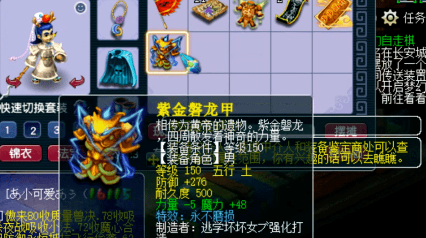 出件150不磨男衣有多简单?有位玩家只打造鉴定了1件150男衣,鉴定后就出了不磨特效。除了不磨特效,衣服上还有极限48点单魔属性加成。衣服初防276也不错,单魔属性加成这么高,给法系用相当合适。这么好的不磨衣服给义气龙穿上,队伍不散群秒不止,天涯海角永相随。