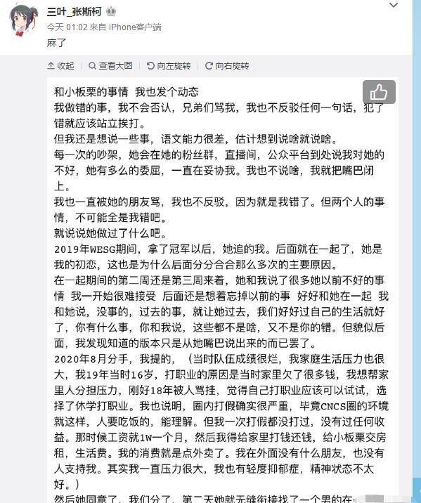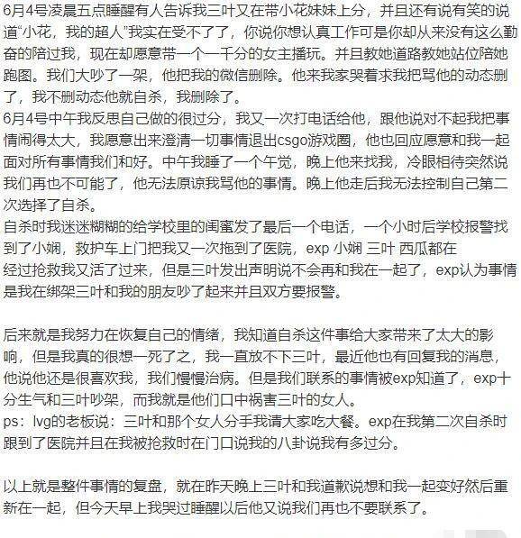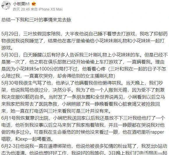 但是小板栗居然在分手第二天便和别的男人无缝连接睡在一起,但很快两人又复合了,经过了长久的相处,三叶被小板栗各种折磨无奈只想好好分个手,并不想伤害任何人,但被小板栗一直纠缠,况且自己并没有说过小板栗的任何坏话,小板栗却屡次在各种社交媒体曝光自己的一些事,这让他很疑惑“我承认我恋爱期间找别的女主播打游戏不对,但我不明白,她分手可以和别的男的上床,我打个游戏怎么了?”