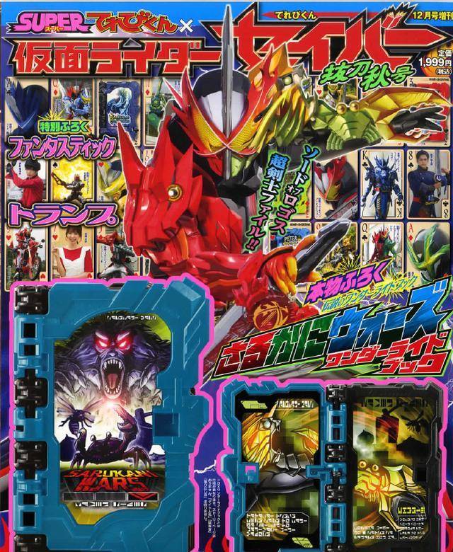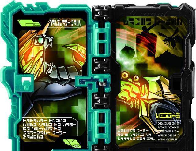 在加假面骑士圣刃里一共有三种力量,分别是神兽书,生物书以及物语书。圣剑驱动器最大的特点就是可以同时使用这三种书籍的力量,当然同属性的书籍会带来更加强大的力量,但对于使用者本身的负荷也是相当巨大的。这里我们看到的就是猴蟹大战物语书展开之后的模样,这本书是源于日本的一个故事,讲述了为什么猴子的屁股是红色的,在书中的介绍就是螃蟹用钳子夹了之后,猴子的屁股就变成了红色。展开之后的模样就是黄色造型的猴子和青色造型螃蟹战斗的场景。