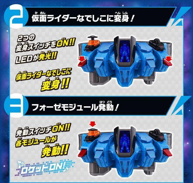 腰带本身的两个插口里装上变身键,按下本体的开关变身。机身颜色是再现了剧中的金属蓝色。自带火箭开关和雷达开关两种。