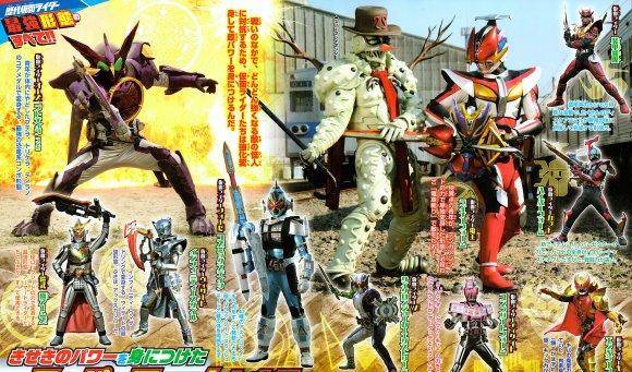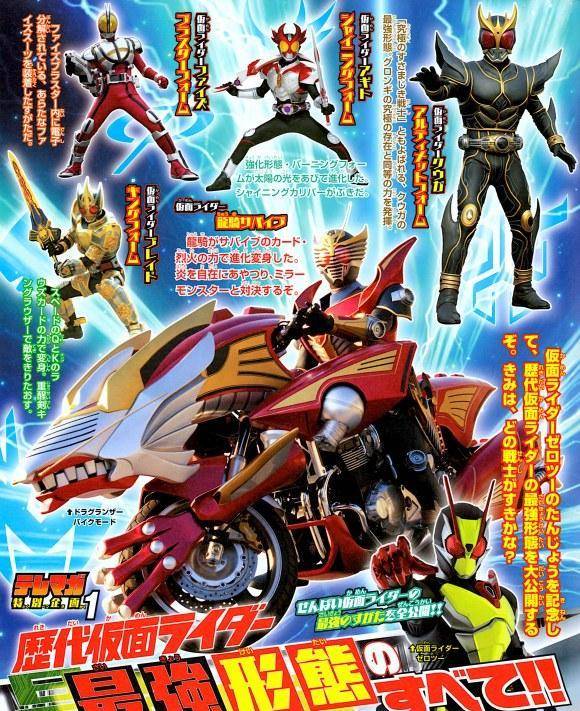 而之后我们看到了假面骑士ooo的恐龙联组,这里官方也算是又一次石锤了最终形态是恐龙联组。同时我们看到了响鬼装甲形态和甲斗的海帕形态登场。而在下方则是铠武的大将军,法爷的无限龙,四仔的宇宙形态,w的极限疾风王牌以及decade的神主牌形态。而在这次的杂志图上我们看到了电王的电车形态,虽说在剧中电车形态的表现一般,但设定方面还是相当强大的。