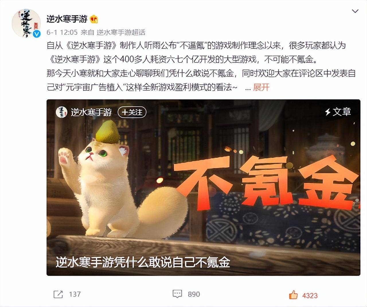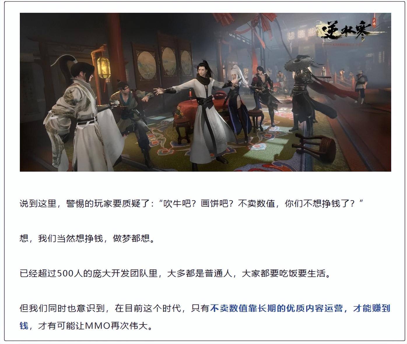 事实上,《逆水寒》手游此前就将“不氪金”定为游戏的制作标准,在大概8个月前,游戏制作人就表示,自己想要靠竞技游戏那样主要依靠外观盈利,并通过“元宇宙广告社区”的计划赚合作厂商的钱。如果一切顺利,“可能会部分舍弃,或全部舍弃数值收费”。