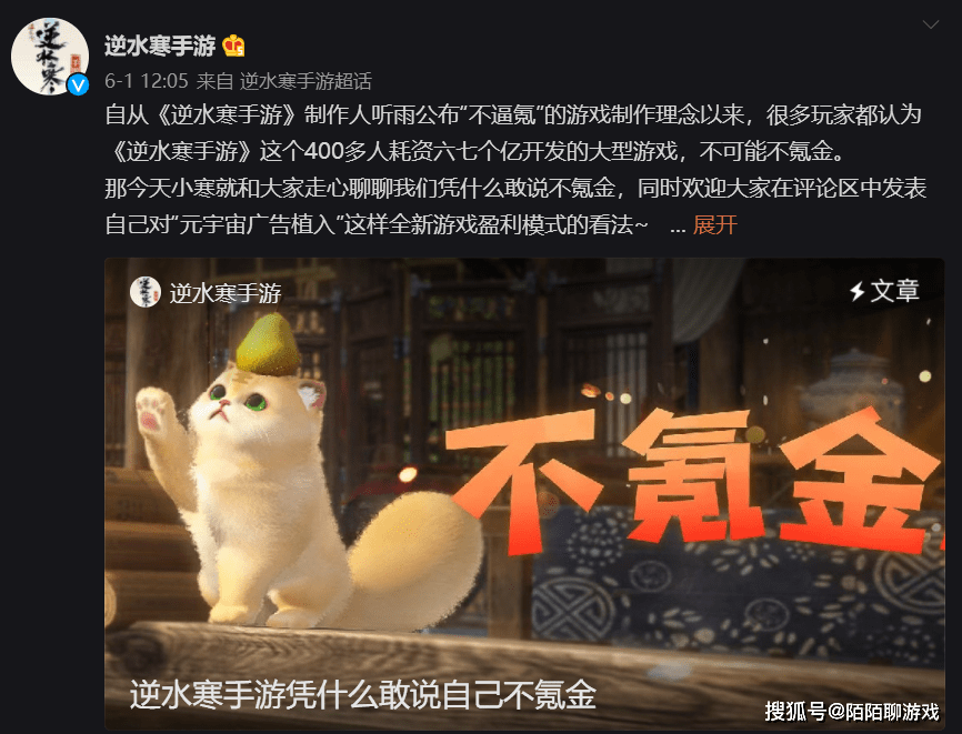 日前,《逆水寒》手游制作人官宣自己“彻底不卖数值”,将采取外观+月卡+元宇宙广告的组合盈利方式,让业内一片哗然。