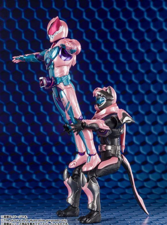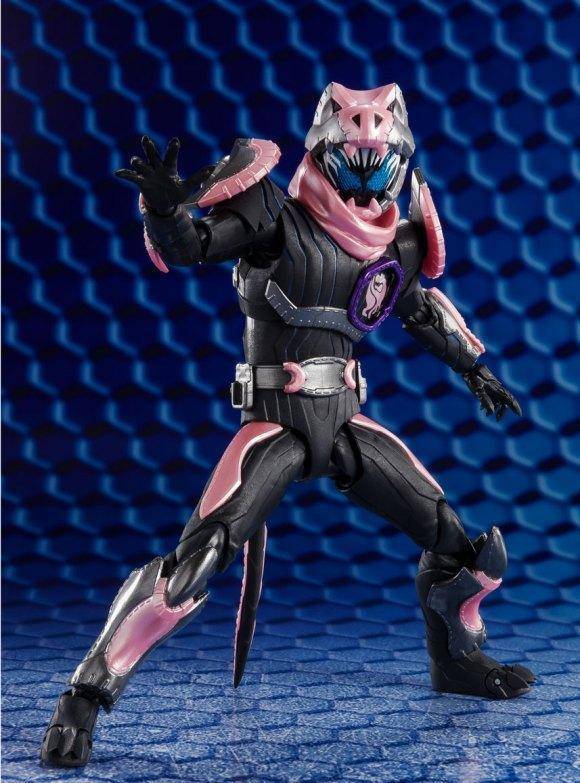而这次shf也是和往年一样都是选择了最为经典的基础形态,首先来说revi这边。作为假面骑士revice里的主骑,revi的设计是有些偏向于反派风格的。头部的设计虽说是以暴龙为原型,但眼睛给人的感觉更像是毒液。肌肉装甲的设计是很帅气的,无论是胸肌还是手臂的肌肉都是肉眼可见的,不过在配色方面看起来还是蛮有少女感的,粉色的骑士的确是相当罕见,虽说个人觉得换成其他颜色或许会更加酷炫一些。