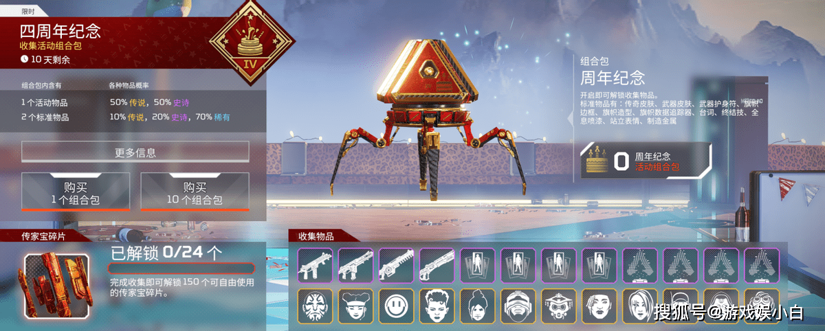 如此别开生面的庆典,自然少不了期间限定的独特收集活动,周年庆期间,APEX也同步开启了周年庆专属的收集活动,总计释出了12款史诗级外观和12款传说级传奇皮肤,传说皮肤分为了四种不同风格,每种风格都独具特色。另外,完成活动的全部收集内容还可以直接领取150块传家宝碎片,自选打造任意一款现有的传奇传家宝。
