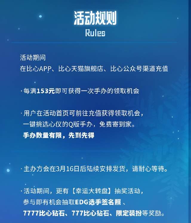 除了这个活动外,在这段时间里面,比心APP还有另一个活动“幸运大转盘”。在这段时间内充值,玩家们可以获得转动幸运大转盘的机会。幸运大转盘可以抽到EDG选手签名照、比心钻石、限定装扮等。虽然这些奖品不如EDG冰岛记忆系列的手办,可对绝大多数比心APP用户来说,是一项很不错的福利。
