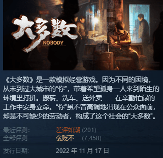 如今我们可以看到,类似“现实主义”的作品也或多或少有想学样在steam上出现,比如《退休模拟器》《大多数》等,但没有了“天时”和第一个吃螃蟹的优势,玩家们就会更多注重游戏的内容和表达本身,《大多数》就在游戏上架不久后被大量差评。另一方面,玩家们对游戏的包容度也不再像2018年那样,这点在《太吾绘卷》的评价中也能看出。