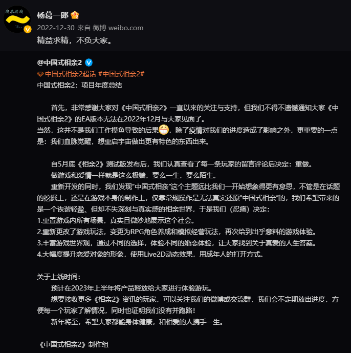 只见当晚, 《中国式家长》的开发商“墨鱼玩工作室”发表了一个声明,撇开和《中国式相亲2》的关系,并表示《相亲2》的制作人杨葛一郎已经离开团队很久。墨鱼玩表示,杨葛一郎是前主美,涉嫌职务侵占和阻挠手游版号申请,会追究他的法律责任。
