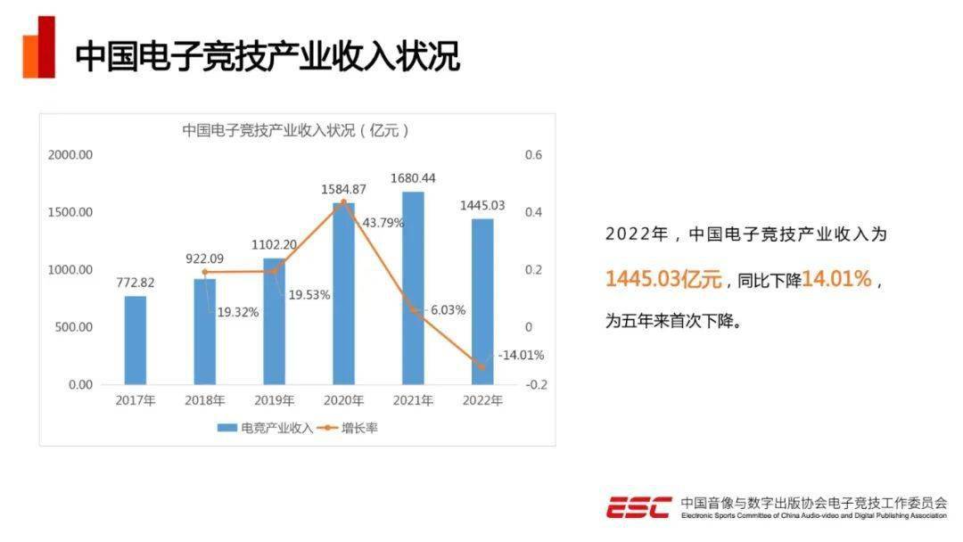 还是先回到报告里的数据。“2022年电竞产业收入1445.03亿元,同比下降14.01%,为五年来首次下降”,这个数据比2020年也低不少。