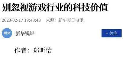 新华社发文:别忽视游戏行业的科技价值。新华社今日发布了这篇文章,开篇引用了游戏工委不久前发布的《游戏科技能力与科技价值研究报告》,称81%的相关从业者认为游戏促进了AI技术的发展;面向大众的用户调研发现,91.4%的受调研者认为游戏领域的一些科技创新对实体领域有一定的推动作用。