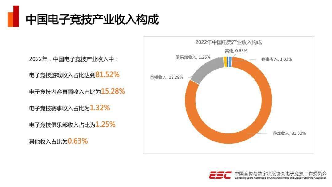 电竞赛事、电竞俱乐部这两项,在电竞观众眼里最核心的垂直电竞产业,在2022年创造的收入仅占1.32%和1.25%,沦落到了电竞产业里忽略不计的地位。