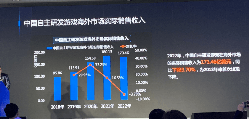 中国游戏出海营收2018年以来首次同比下降。13日举办的2022年度中国游戏产业年会上,发布了《2022年中国游戏出海情况报告》。数据显示,2022年,中国自主研发游戏在海外市场的实际销售收入为173.46亿美元,同比下降3.70%,为2018年来首次出现下降。其中英国地区下降最为明显,高达16.7%,德国仅次于英国,下降15.7%,美国、日本、韩国分别下降了4.5%、11.1%、6.7%。