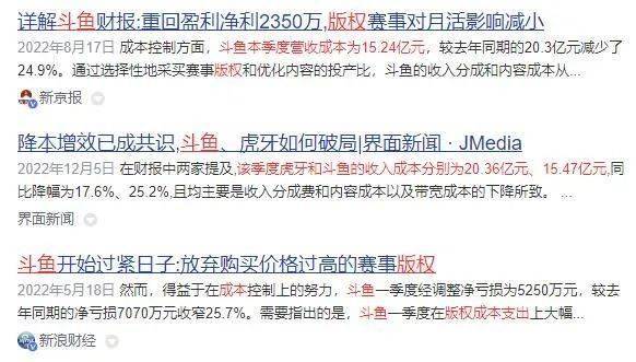 同样有这个问题的还有占比超过15%、约合216亿的内容直播收入。要知道过去一年,斗鱼和虎牙两大平台的营收加起来不到170亿,考虑到两家合并失败时,外界透露他们合计的市场占有率有80%,报告里的“内容直播收入”大概也是把所有能和电竞扯上边的直播平台的业绩都算上了。讽刺的是,斗鱼之所以能在2022年转亏为盈,就是减少了在赛事版权上的非理性投入。