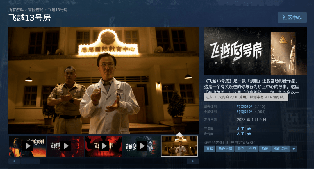 在此之后,他们又在今年年初上线了互动影游《飞越13号房》 ,游戏上线次日就登上了全球热销榜Top 2,视频和直播平台上少说有数百个主播直播过,其中不乏PDD、大司马、周淑怡、逍遥散人、老E……等等头部主播。在2019年的《隐形守护者》之后,这可能是国内这么长时间以来相对最火的一款互动叙事游戏了。