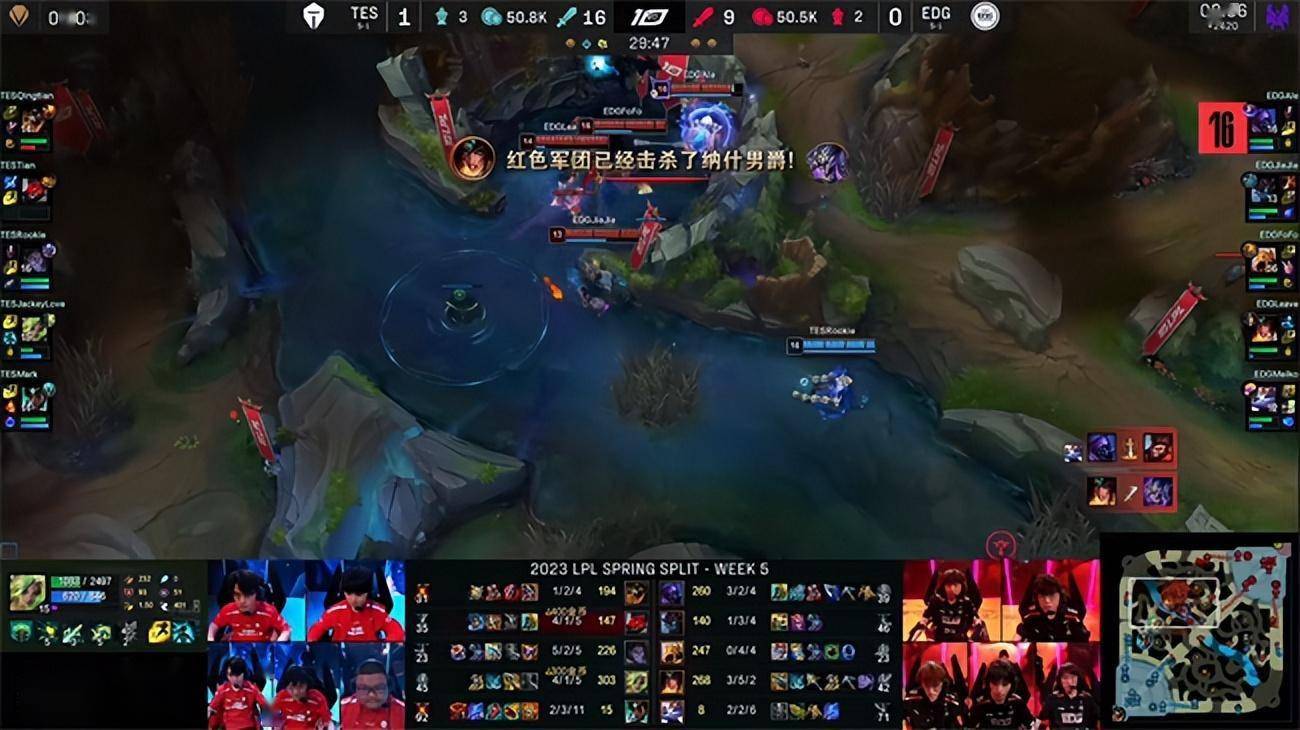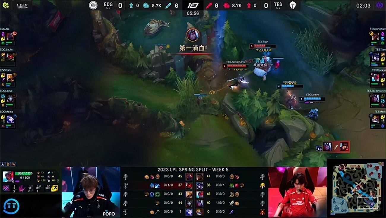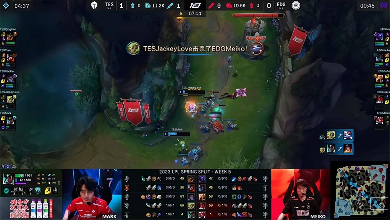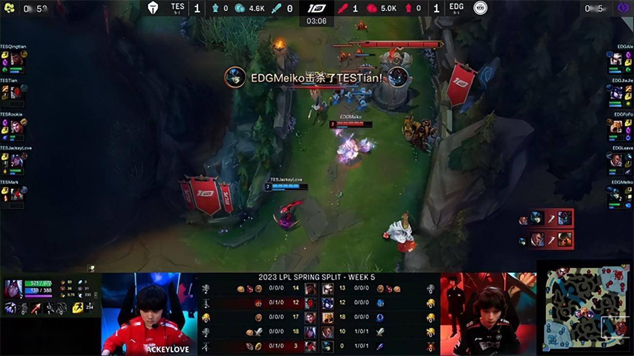 2023 LPL春季赛常规赛第五周第七日,EDG战队对阵TES战队,两队目前都是5胜1负状态火热,在比赛中也是棋逢对手打的非常胶着,第一局比赛EDG下路陷入劣势,依靠沙皇的操作一度在中期占据上风,但TES很快调整战术精准针对拿下了比赛胜利,第二局TES依然从下路撕开突破口,屡屡在野区开战得手,EDG稳住阵脚稳健拉扯运营最终利用TES决策失误完成翻盘。决胜局双方在前中期一度有来有回非常胶着,而TES牢牢把团战主动权掌握在手里,两波果断的大龙决策迫使EDG露出了破绽,最终TES 2-1N拿下比赛胜利。
