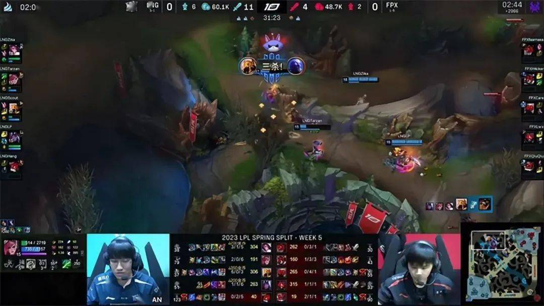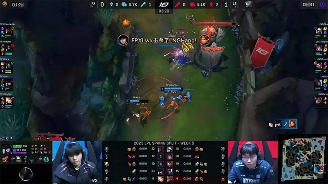 2023 LPL春季赛常规赛第五周第七日,LNG战队对阵FPX,第一局比赛凭借中野的发挥轻松取胜以后,第二局前期FPX一度取得了很大主动,但随着LNG灵活的运营与分推决策,FPX的战术执行陷入了僵局,最终被LNG强拆基地遗憾落败,LNG 2-0轻取FPX。