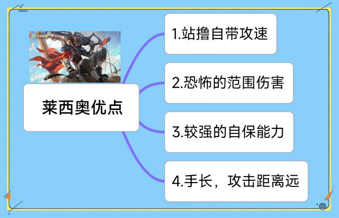 以上这些优点都是莱西奥成为万金油射手的主要原因,不管什么辅助莱西奥都可以驾驭,所以莱西奥是一个不吃阵容的英雄,不管是单排还是多排,我们都能驾驭。