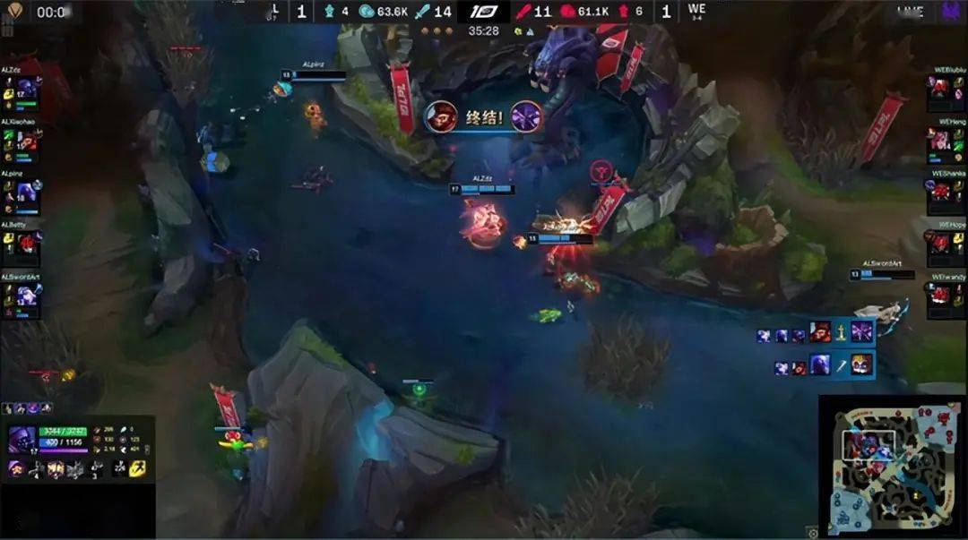 蔚刷到3级选择gank下路,不料AL中野及时支援赶到,背靠防御塔四打二打出2换3,WE三人全部阵亡。猴子见状抓上得手,孤立无援的贾克斯无奈倒地,作为止损WE抱团控下炼金小龙加峡谷先锋。前期WE的推塔节奏很好,韦鲁斯和女警早早地推掉AL下路一血塔,再换线到中路掩护先锋撞掉AL一塔的镀层。AL被动换线防守,主动权一直在WE手中,AL接连放掉了火龙和上路一塔。14分钟猴子带猫在上路河道先手开团,AL上中野控制combo拉满,打出0换2推掉中路一塔稳住了节奏。WE转而掩护瑞兹推掉下路一塔。