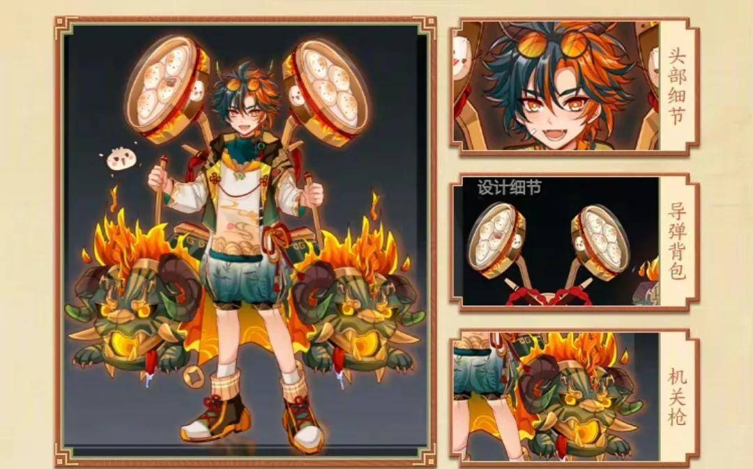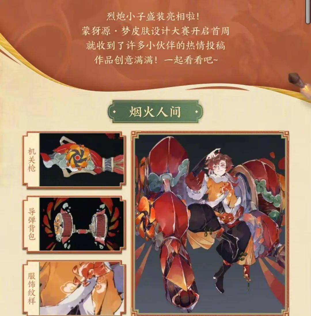 作品烟火人间设计的亮点有机关枪,导弹背包和服饰纹样,这款皮肤整体特色非常鲜明,配色采用的也是绿色,红色,金色和雪白,给人一种喜气洋洋的感觉,蒙犽手拿机关枪,身上背着一个导弹背包,看上去就像是一个元气满满的少年,衣服上还有一些特殊样式的花纹,整体的国风设计亮点比较多。