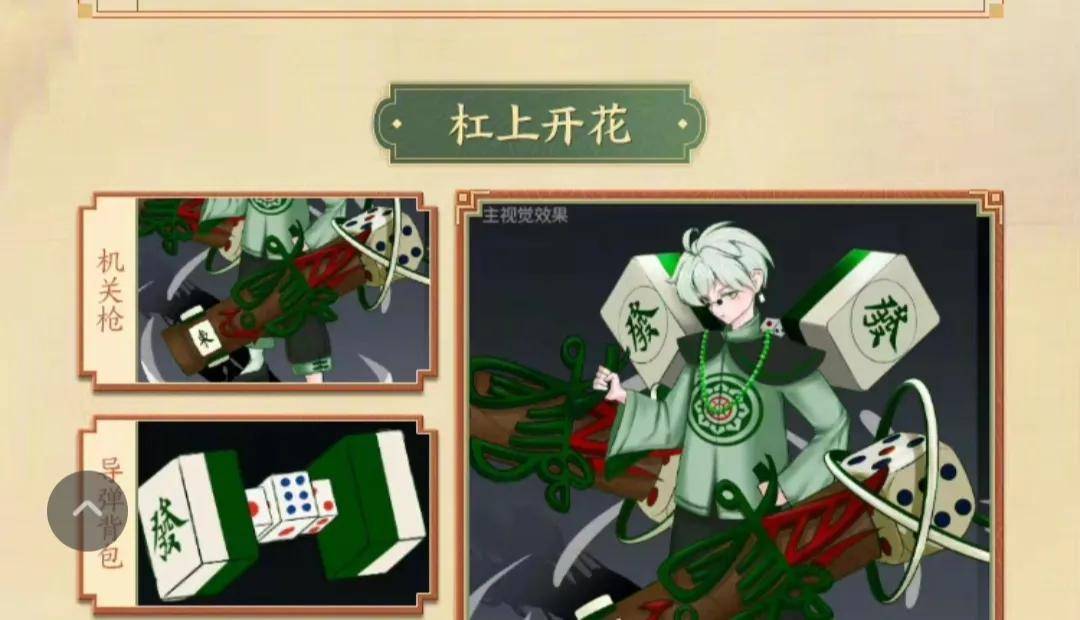 杠上开花设计的背景还是蛮有意思的,蒙犽意外进入到了时空碎片当中,去了一个和麻将相关的世界,为了不让别人发现他的与众不同,所以他把武器都改成了和麻将有关的样子,比如说机关枪是有骰子和麻将东的设计,导弹背包则是有发和1.6点三点的设计,服饰图案上面也采用了麻将背面的花纹,亮点还是不错的。