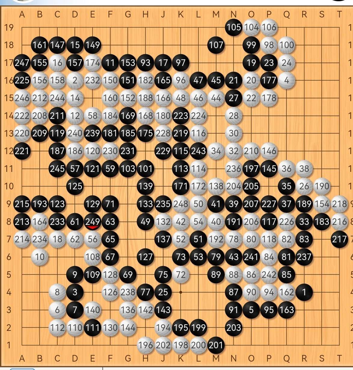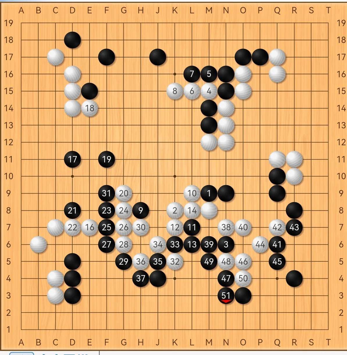 在接下来的冲突中,112被控时,123吃多了,导致126亏本转亏为盈。当它达到140时,局面变成了缓慢的白棋前进。棋局小胜只能说是偶然,居然走到了这一步。见下图:1-49(实战92-140)
