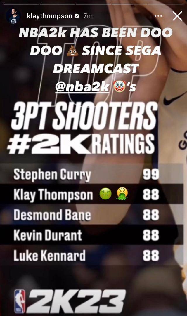 对于自己三分球评分只有88一事,汤普森也在社交媒体上表达了强烈不满,并怒斥2K公司就是一群傻子,“2K在1998年发售后的2K2之后就已经成为一坨屎了,就是个小丑。”同时,汤普森还更新了一张自己三分球命中数的排名照片,“对我的名字放尊重点,你们这群傻X。”