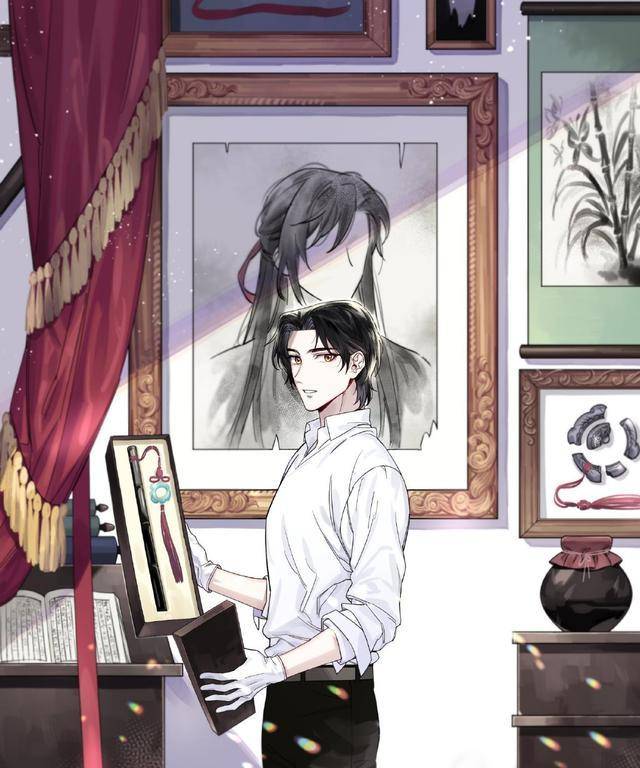 与现代版的魏无羡相比,现代版的忘机同样是眉清目秀,而且气质上还多了几分霸道总裁的范儿,这白衬衫黑色西裤搭配短发的造型,简直A爆全场有木有?话说忘机房间里的收藏还全是关于魏无羡的东西,从天子笑到陈情笛一样都不能少,最引人注目的莫过于他身后的老祖画像,无形间又秀出了汪叽绘画技能MAX的天赋。