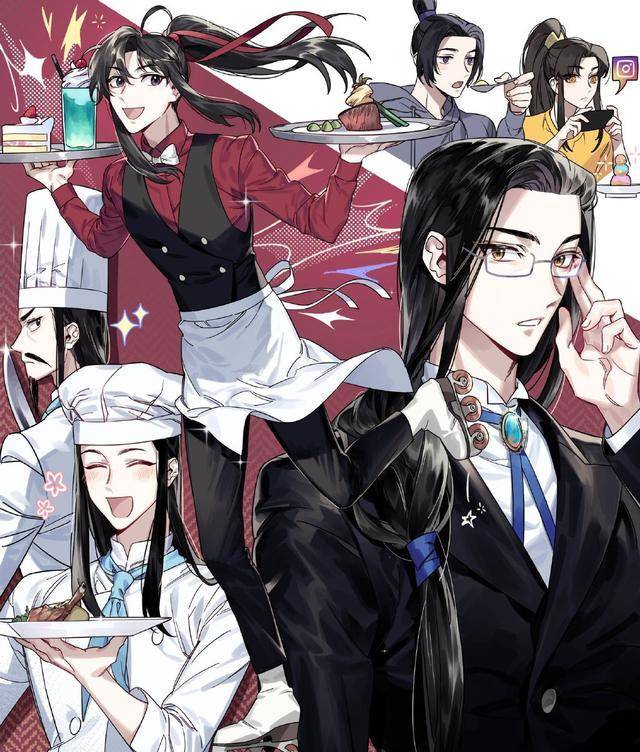 另外这张“云深西餐厅”版的众人也是十分有意思,穿着一身西服戴上金边眼镜的蓝二哥哥真是英俊到没朋友,话说如此谨慎的餐厅老板,怎么会招了个皮皮羡这样不靠谱的侍应,还踩着滑轮送餐,一旁的蓝启仁大厨可是刀子都准备好了,看准羡羡哪天失误就是一顿胖揍。当厨房学徒的蓝思追似乎对自己的菜式感到非常满意,脸上露出乐开花的笑容,一旁光顾着吃美食的江澄,根本不能理解金凌拍摄食物嗮朋友圈的行为。