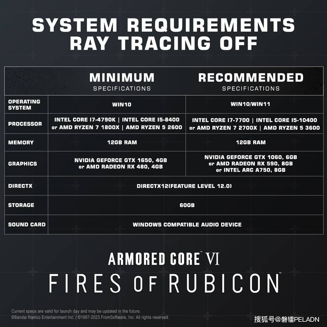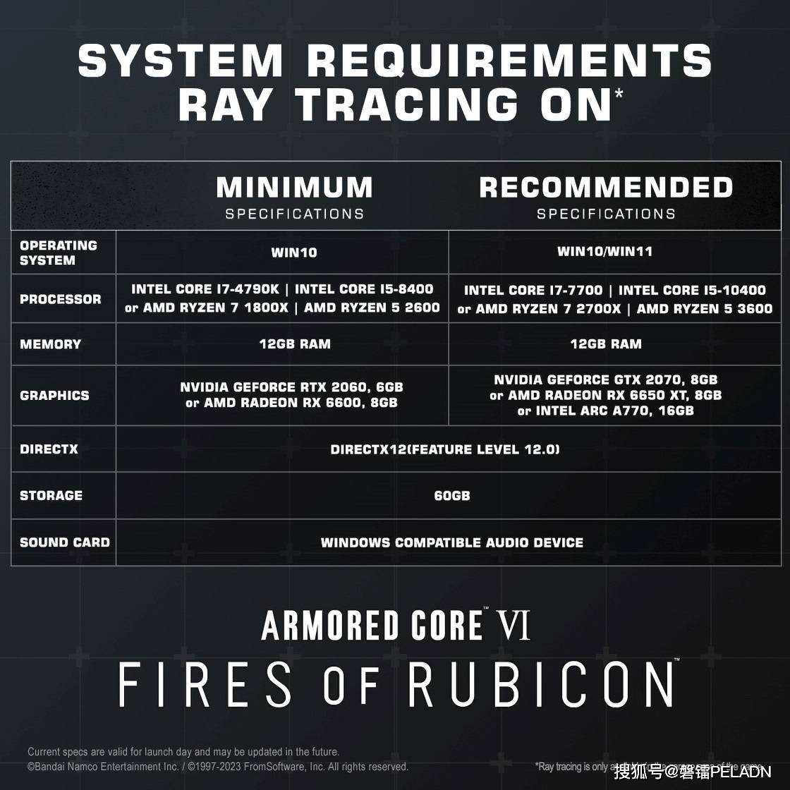 《装甲核心6:境界天火》的配置要求分为两项。如果玩家不需要打开光追来游玩的话,最低CPU是英特尔酷睿i7-4790K、i5-8400,或者是AMD锐龙7 1800X、锐龙5 2600;显卡则是英伟达GTX 1650或AMD RX 480。推荐要求CPU为英特尔酷睿i7-7700、i5-10400,或者是AMD锐龙7 2700X、锐龙5 3600,显卡则为英伟达GTX 1060、AMD RX 590、英特尔Arc A750。