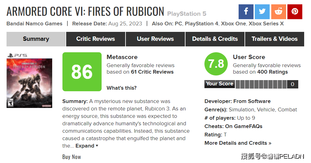 而在Metacritic网站上,《装甲核心6》也正式取代《装甲核心2》(MC评分78分),成为系列游戏评分最高作品。目前《装甲核心6》在M站上已获得了61份评价,均分86分。