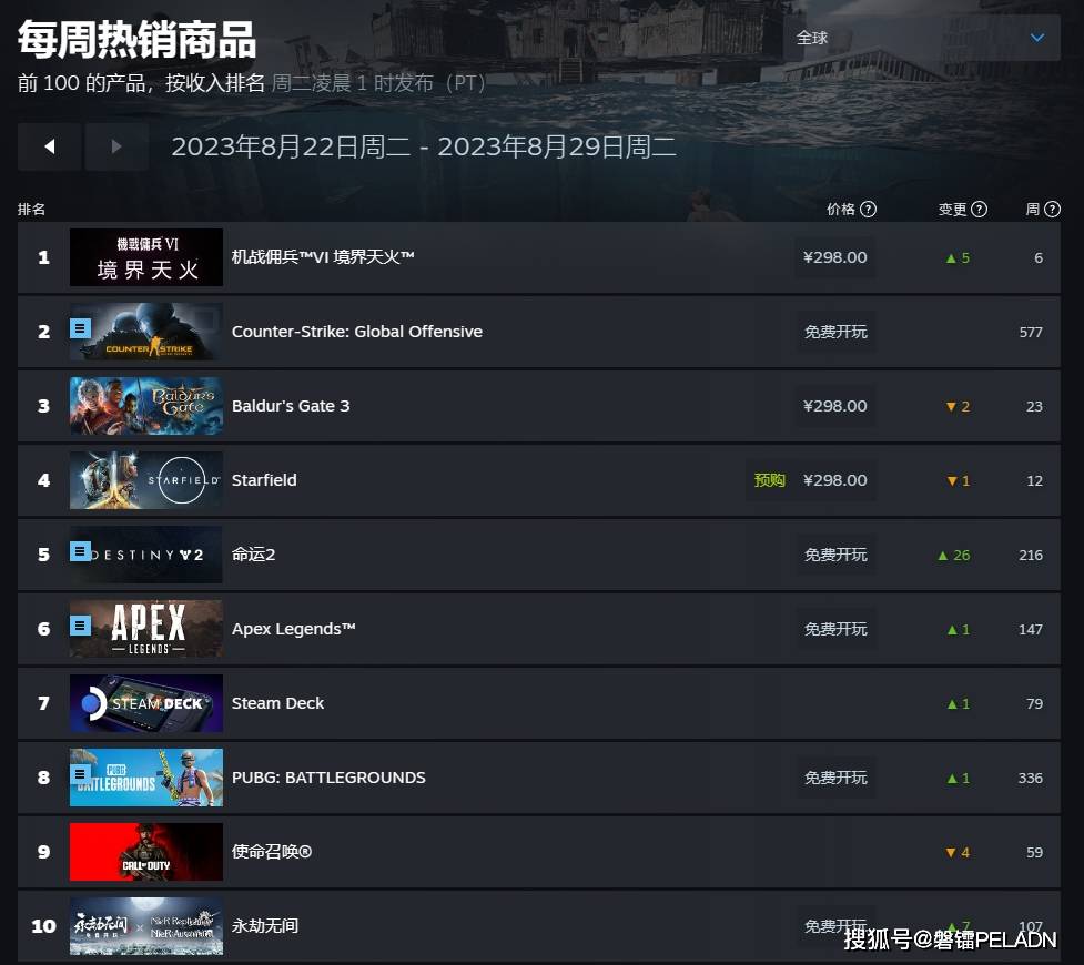 据Steam商店一周销量排行榜显示,《装甲核心6:境界天火》击败之前连续三周霸榜的《博德之门3》成功登顶,玩家在线游玩人数峰值也达到了156173,该数据超过《只狼》、《黑魂3》等游戏,成为FromSoftware公司第二高的作品。