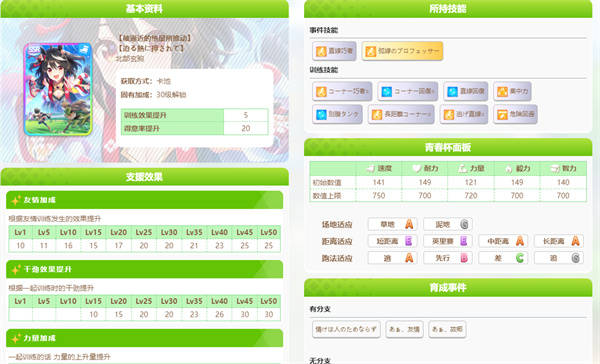面板能力强,在长距离比赛中,有这张卡的体力恢复技能需求,可以保证耐力属性的稳定,可以说是耐力卡荣光。