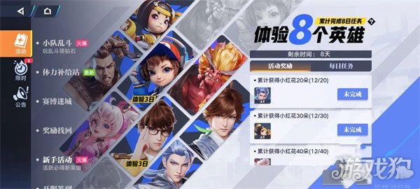 要想得到系统开局赠送的英雄,需要先去参加新手活动,这是在本次测试中非常简单而且专属于新手的福利。需要大家去完成每天任务,包括达到指定对局场数,活跃度,以及每天进行登录等就可以获得小红花,然后累计一定总数小红花就会赠送各种角色了。20朵的时候赠送破灭刃锋凯,30朵送机关造物,后面随着增多赠送甜甜微风小乔,青莲剑仙李白等,直到最后达到80朵时赠送四星级紫色角色峡谷之兽,这是当前新手所能获取的最强势人物。