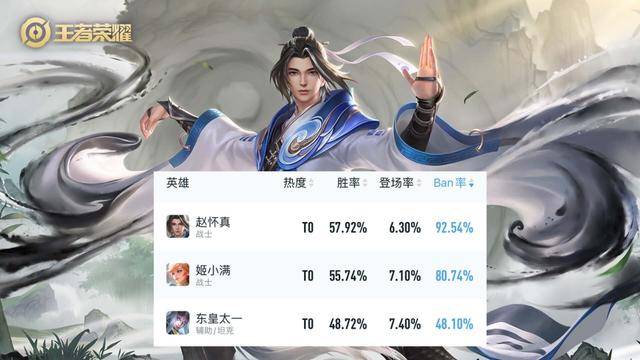 随着大家对赵怀真的了解越来越深刻之后,可能很多玩家都想象不到,目前赵怀真在巅峰赛的禁用率中,已经接近百分百了,这个数据足以证明大家对赵怀真的看法。