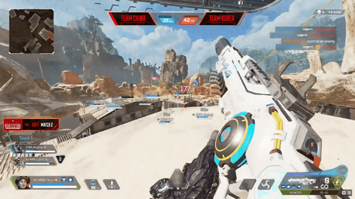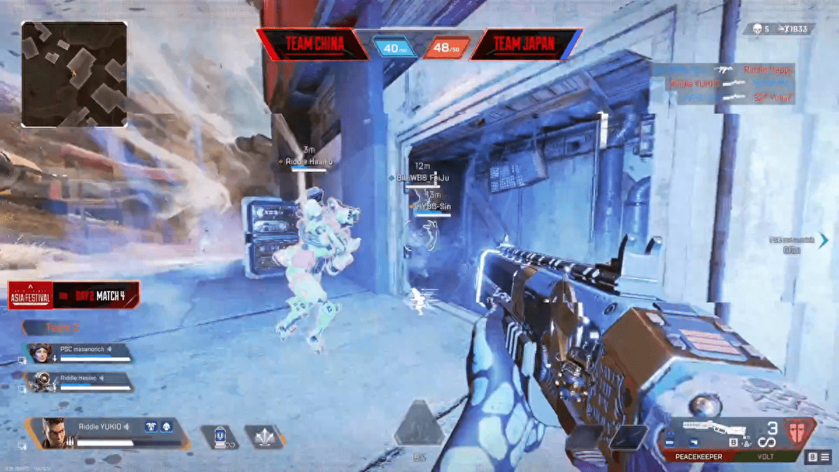 比起战术竞技模式里DYHB战队的摧枯拉朽,中国选手们在本次APEX亚洲尖峰嘉年华中团队竞技模式副赛道的历程却稍显曲折。首战面对韩国队时,皮特、小凯、卡莎组成的“游击组”迟迟未能突破敌方阵线,飞狙、明月、老吊所在的“防守组”也一直未能占领高点,整个中国代表团一度陷入8分之差的比分劣势,直到最后老吊凭借EVA-8单人收获三杀才让全队扭转颓势,以50:48的险胜结束首场对局。