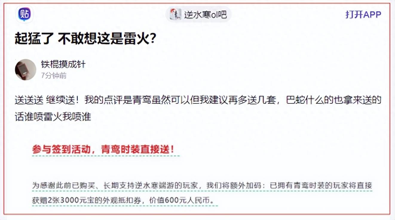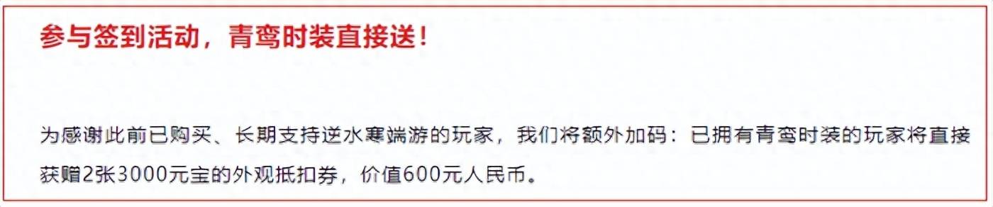 而之前曾经购买过这套时装的玩家也能获取到价值600元的外观抵扣劵,大可以再免费换套自己喜欢的时装,甚至于不只一套,因为在新资料片中《逆水寒》还大幅调低了时装的售价。