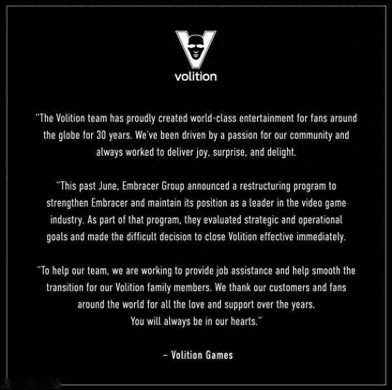 Embracer Group在一份声明中提到,市场动态的转变和战略调整是这一决定背后的原因。尽管面临种种挑战,该公司对曾经参与Volition历程的所有优秀个人表示感激,并承诺支持他们顺利过渡到新的职业道路。