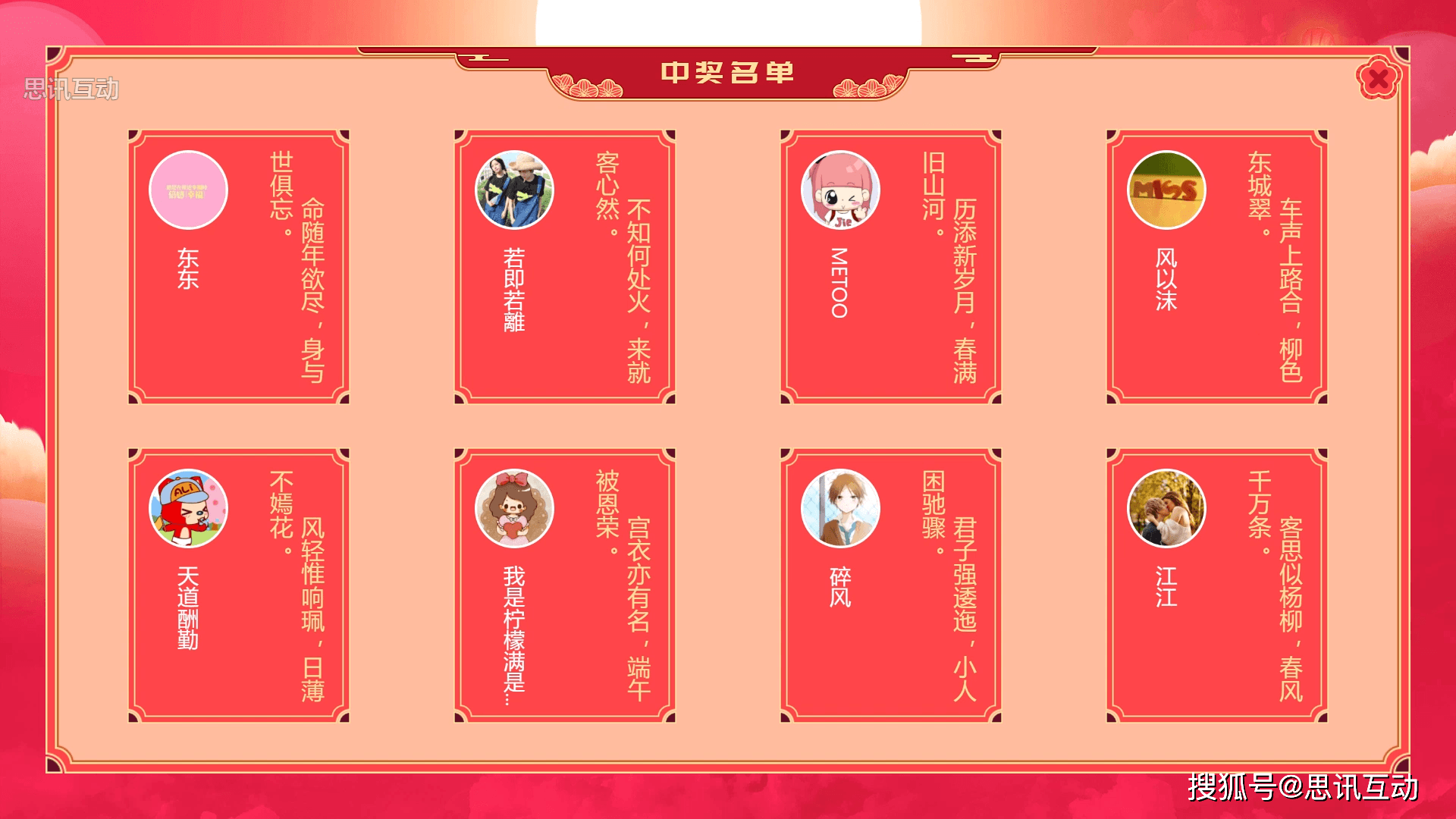 全网独家, 无论是抽奖默认的背景还是卡片、中奖名单以及装饰等小元素,都非常具有中国风格气息;中奖结果也以传统书法的书写形式进行排列(从上到下,从右向左);红色喜庆,非常适合企业年会、企业开工等活动的抽奖;