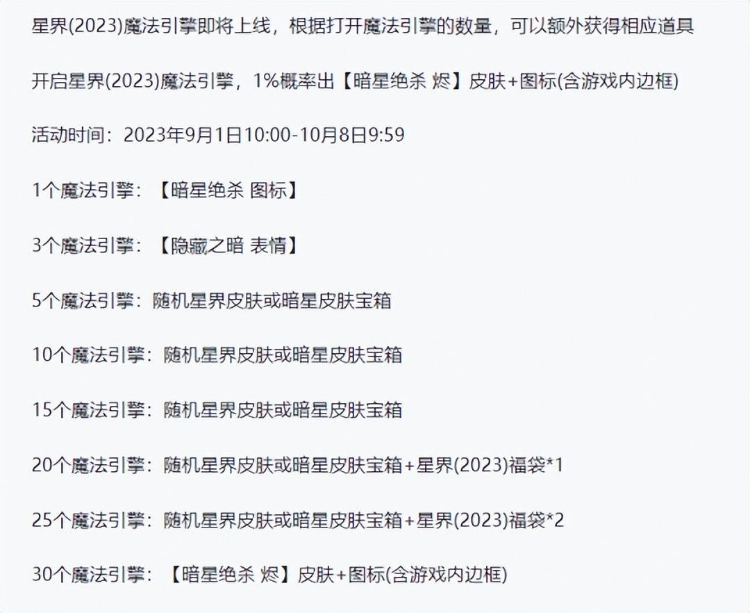 令人困惑的是,拳头官方还真的把暗星绝杀烬给当成了这次活动的压轴皮肤来处理,玩家正常开星界魔法引擎只有1%的概率能开出暗星绝杀烬,只有通过积累开30个魔法引擎的方式才可以获取这皮。目前30个星界魔法引擎的官方售价为1170!