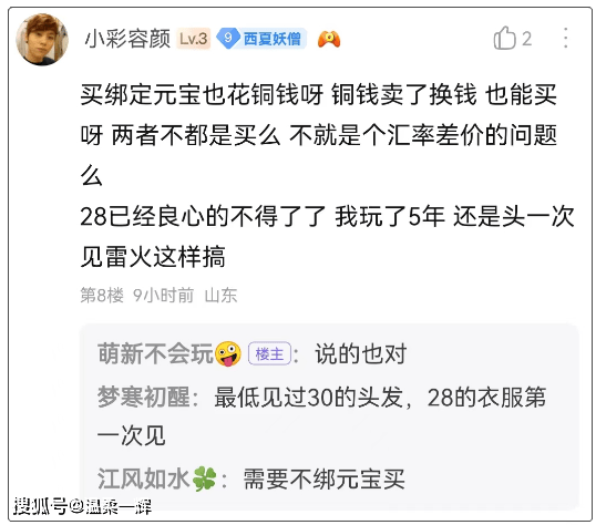 玩过五年端游的老玩家感叹:“网易真是MMO的神,第一次见卖这么便宜的时装,头一次见雷火这么搞,良心的不得了。”