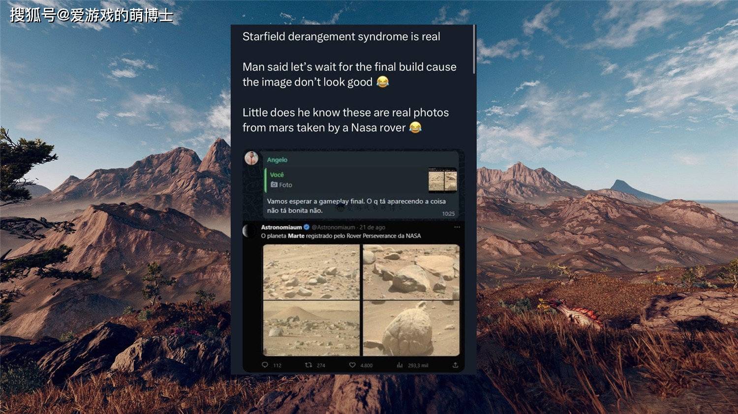 你没看错,有些人以为真实火星的照片是《星空》的游戏画面,然后还煞有介事、一本正经地评价了一番,贻笑大方!玩家们看到这么搞笑的事情,自然也纷纷各抒己见:“引擎差不多嘛,物理效果一点都没变”、“造物主真应该更新一下宇宙图形引擎,现有的已经过时了,虽然它已经有数十亿年的历史”、“恐龙是地球这款游戏被删减的内容,因为它们太OP了”等等。