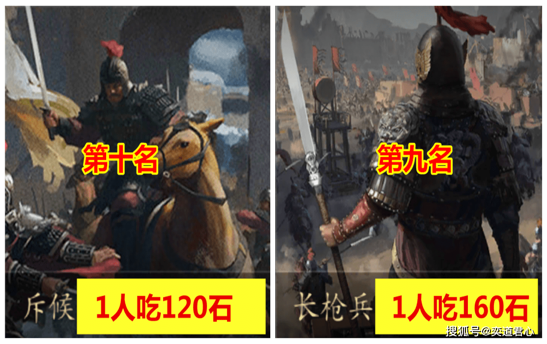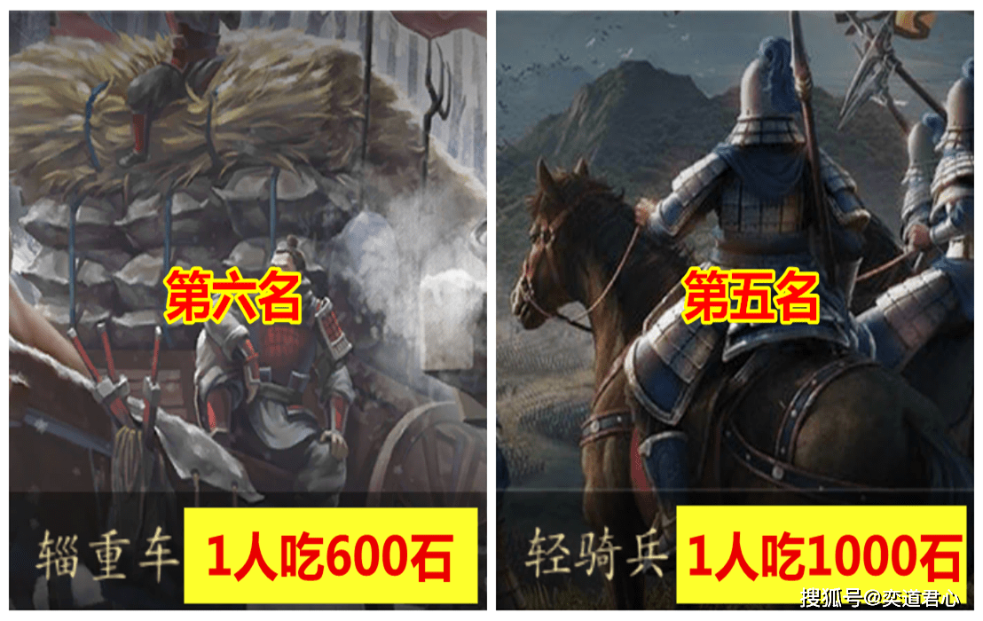 辎重车在游戏里的定位和斥候探马差不多,基本不会用于正式的战斗,不过拖车的骡子很累,司机和骡子两张嘴,自然没有600石吃不饱。第五名的轻骑兵,战马跑得更快,肯定消耗量更大,从轻骑兵开始,每个小兵的耗粮突破了1000石。