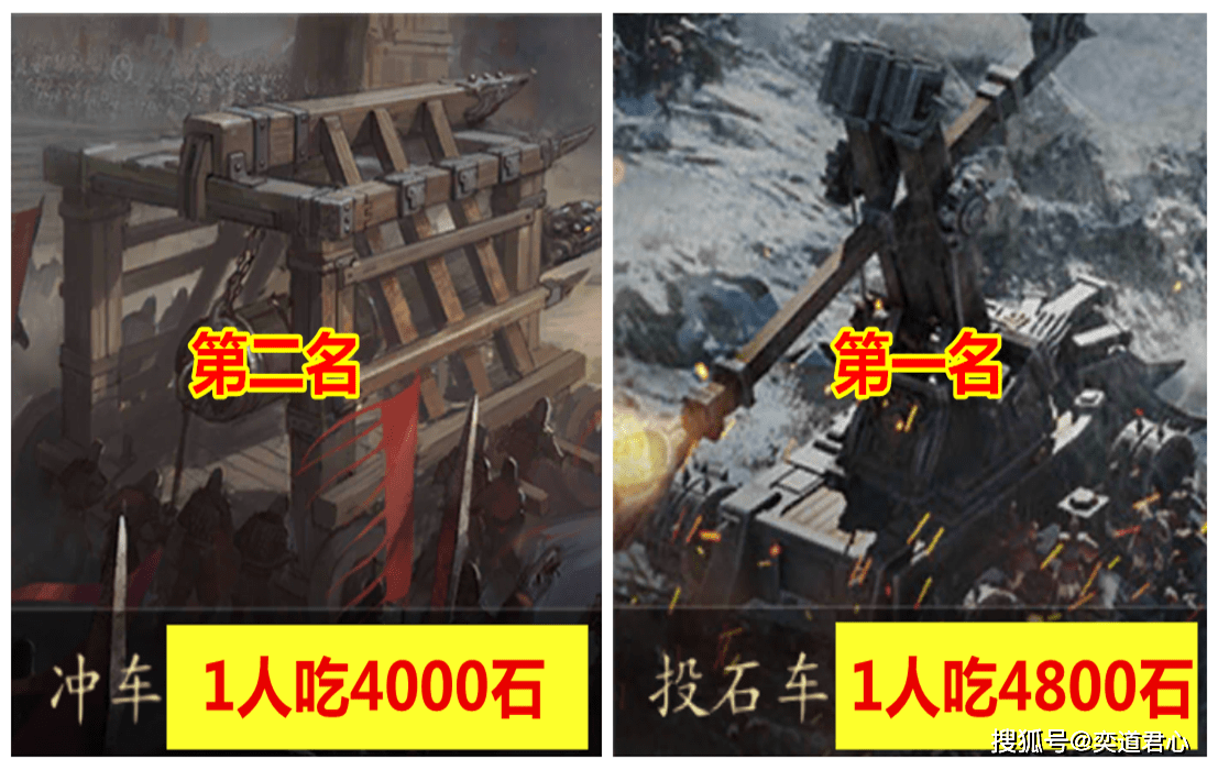 这俩都是大家伙,相当于现代战争里的坦克和火箭炮。冲车是《军令如山:王者之心》手游里护甲最强的兵种,对于城墙的伤害也最高,单兵4000石的粮耗位列榜眼。投石车则是物理伤害和射程第一的兵种,也是实际利用率最高的,1人吃掉4800石的记录堪称当之无愧的大胃王。