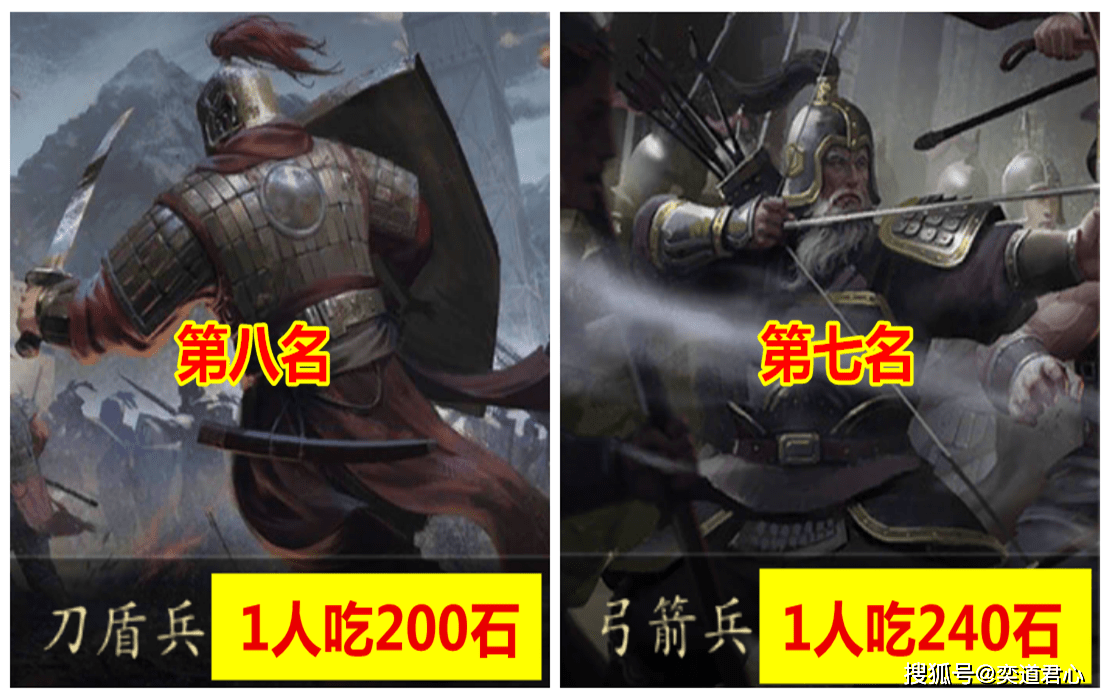 盾牌与箭弩,那是一对天生的冤家,《军令如山:王者之心》的兵种克制关系,也让以穿刺为主的弓箭兵吃尽了刀盾兵的苦头。吃粮第八的刀盾兵,1人消耗的粮食为200石,第七名的弓箭兵看着轻巧,然而拉开一张弓所耗费的力气也是非常多的,所以他们吃得也更多,需要240石来保证体力。