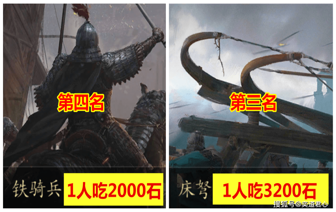 从头到脚都包裹着厚重铠甲的铁骑兵,无疑比轻骑兵要吃得更多,每人2000石的需求估计大部分都喂给了马。以第三名床弩为界,接下来都是器械类单位,驱动床弩的士兵那必须是技术工,3200石既是粮食也代表着高工资。