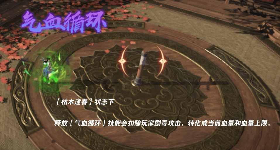 此时释放【气血循环】可以把剧毒攻击转换为当前的血量和血量上限,能进一步保障玩家的生存环境。但最好是能在大部分技能都进入CD时释放,以避免损失输出。